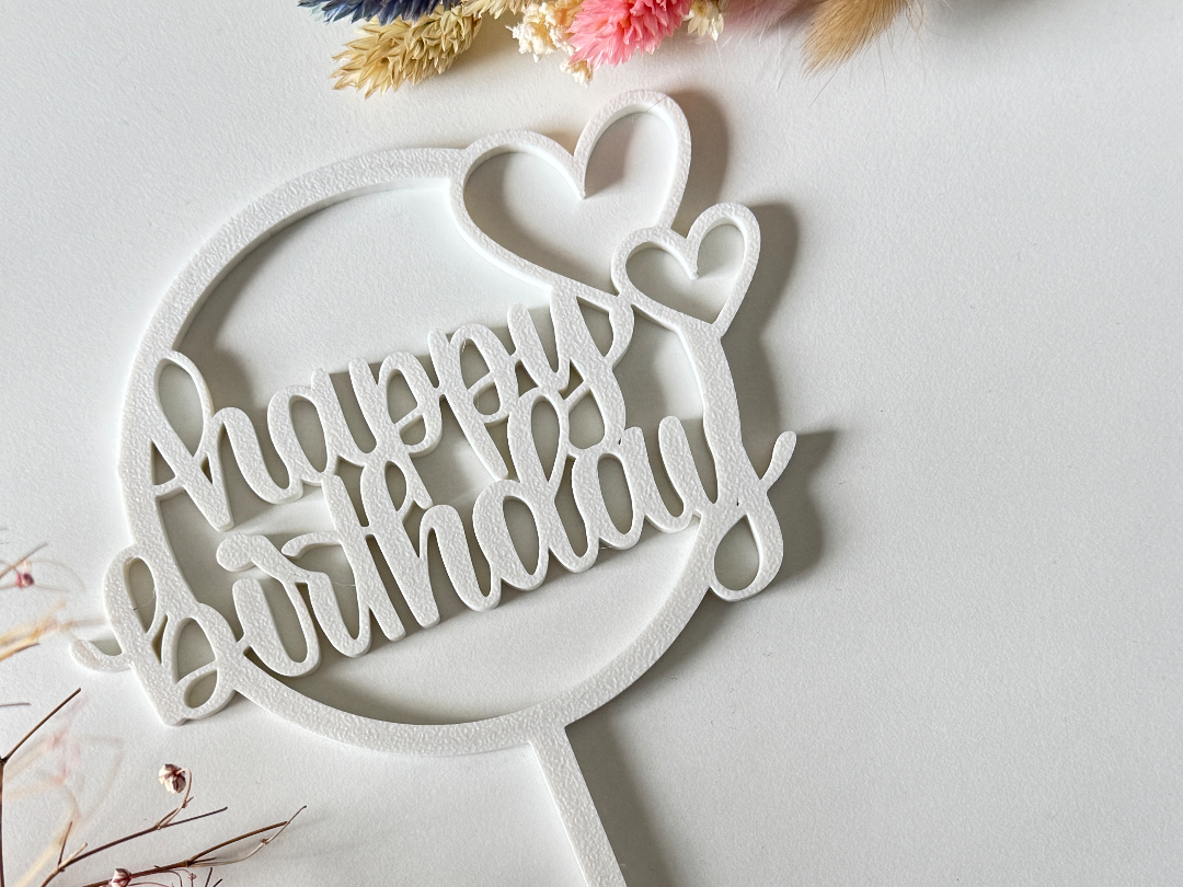 A beautifully elegant Happy Birthday cake topper featuring flowing script lettering inside a circular frame with two sweet heart accents.