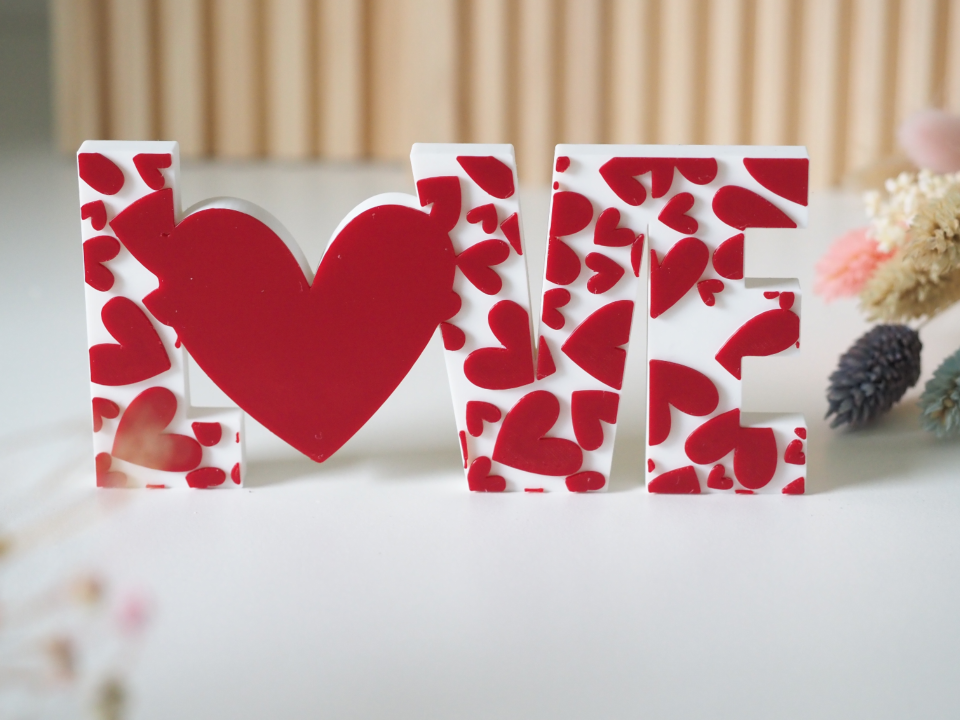 Celebrate love in a bright and joyful way with this layered LOVE decor sign, designed with a striking red heart at the centre and a playful pattern of hearts flowing across the letters.